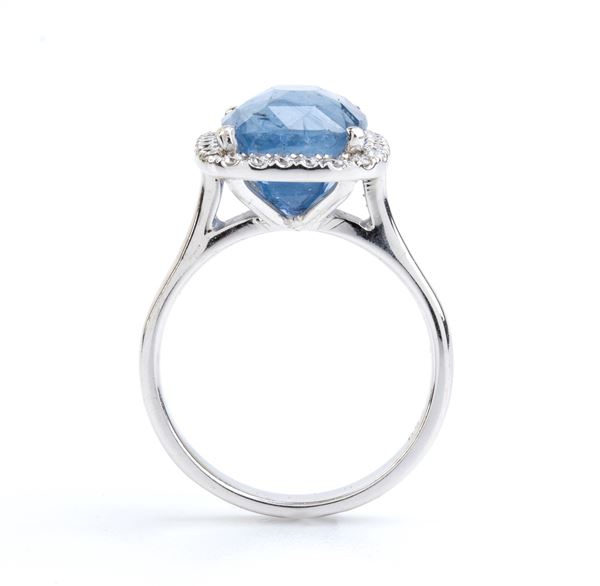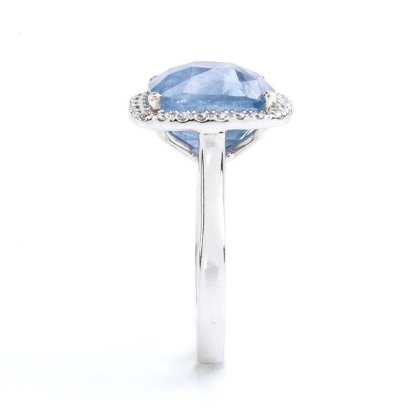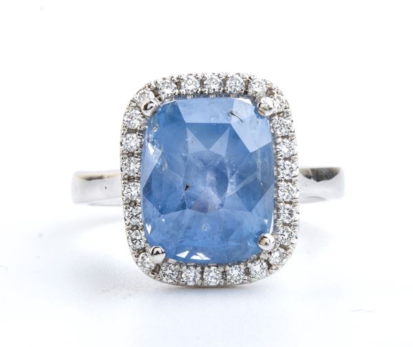 18k white gold embellished by a central Ceylon (SRI LANKA) sapphire surrounded by diamonds.