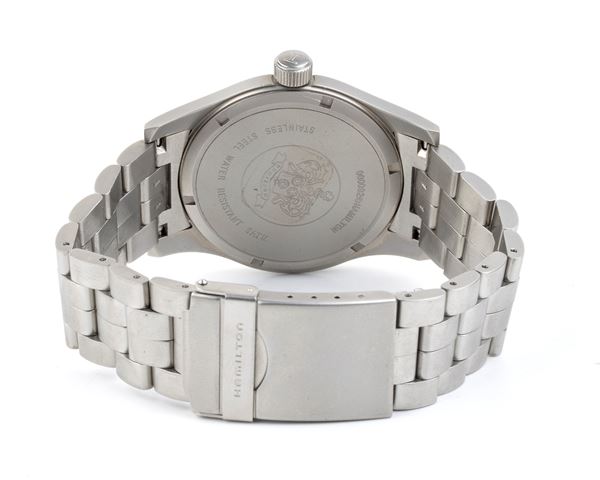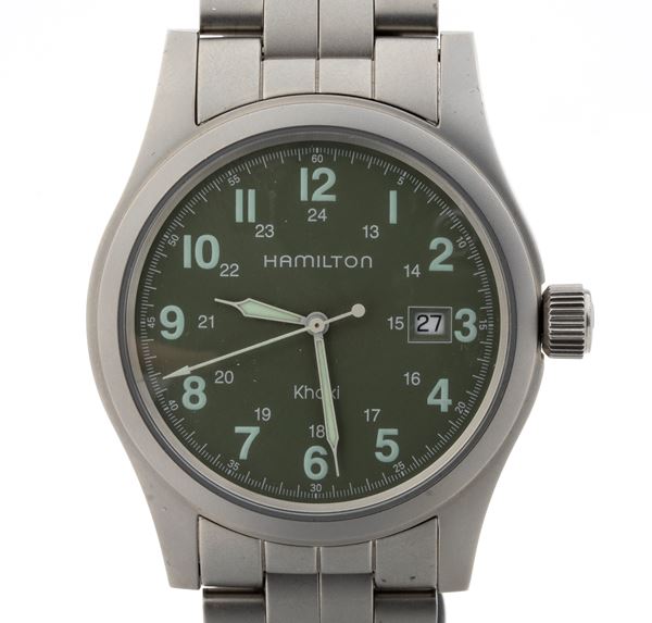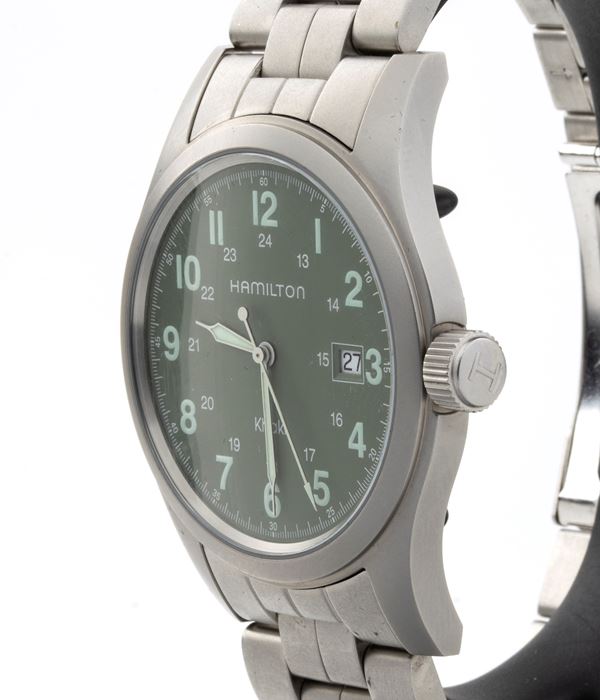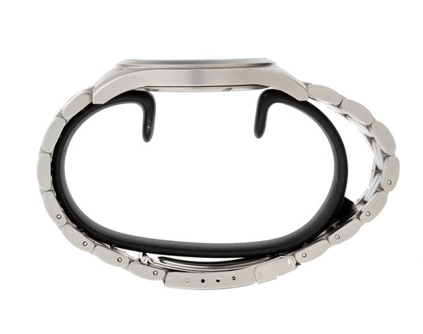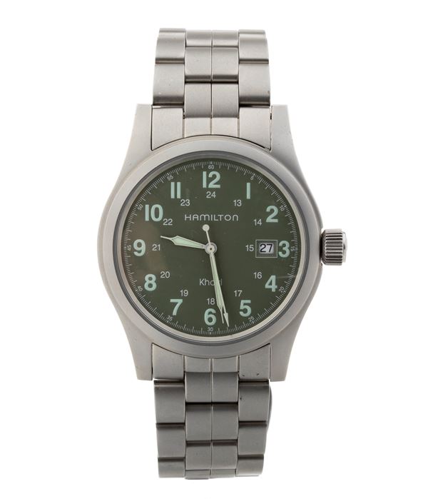 Satin-finished steel case and bracelet with date window at 3 o'clock, military green square, Arabic hour markers
