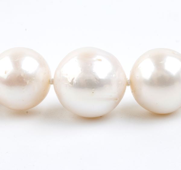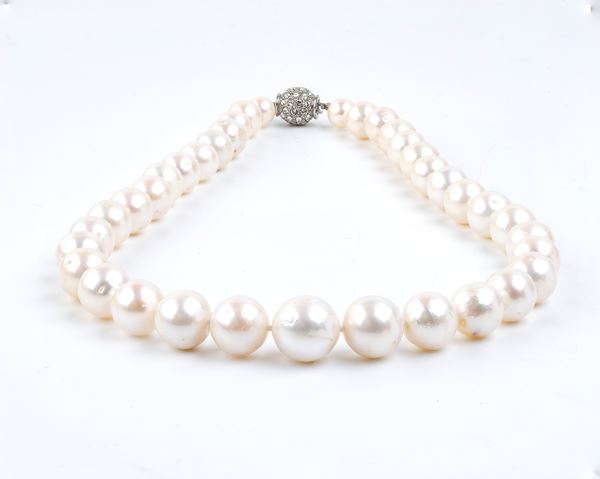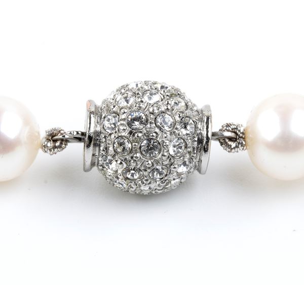 one saltwater cultured pearls strand, hidden clasp in low title white gold set with glass pastes.