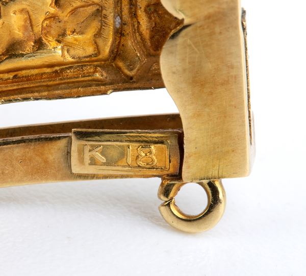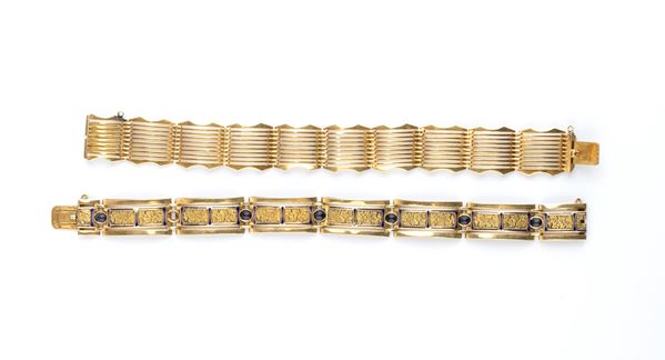 one 18k yellow gold bracelet, decorated with maple leaves, blue enamel, and n. 06 cabochon cut oval shape blue sapphires, hallmarked "18K", length 18.2 cm; one geometric openwork bracelet, length 17,5 cm.