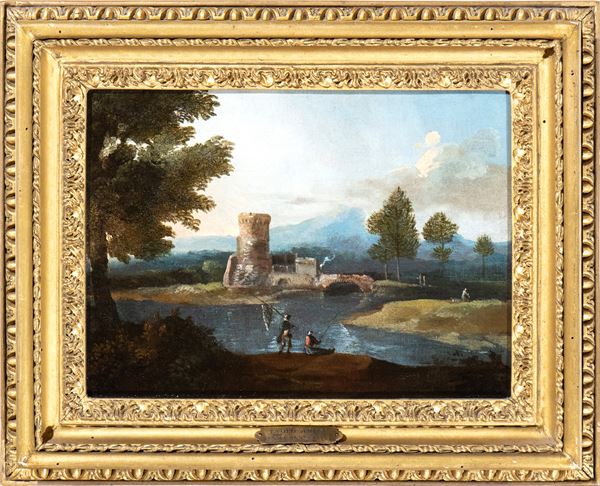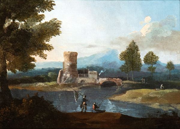 a) Landscape with river, bridge and two fishermen; b) Landscape with river, keep and two fishermen. Pair of paintings