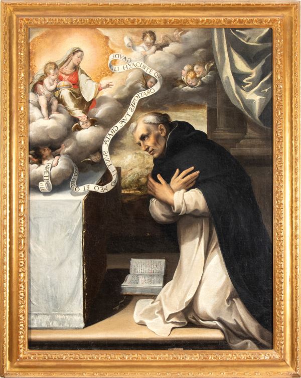 Questo intenso dipinto è una notevole testimonianza della fase di trapasso della pittura italiana e specificamente bolognese, a cavallo tra XVI e XVII secolo, da un linguaggio pittorico tardo-manierista verso codici figurativi di più vivido naturalismo e di più genuina espressione delle emozioni e delle passioni umane, attraverso un diretto avvicinamento ai modelli della realtà naturale. Di tale trapasso furono assoluti protagonisti Annibale e Ludovico Carracci: e proprio quest'ultimo si direbbe il riferimento più prossimo dell'autore del nostro dipinto, in particolare il suo celebre capolavoro, oggi al Louvre, in cui è raffigurato lo stesso episodio della visione di San Giacinto. Secondo l'agiografia essa si verificò quando Giacinto, di origine polacca, fu costretto ad abbandonare Kiev durante l'attacco dei Tartari ed ebbe l'apparizione della Madonna che lo pregò di mettere in salvo una sua statua promettendogli la sua protezione.