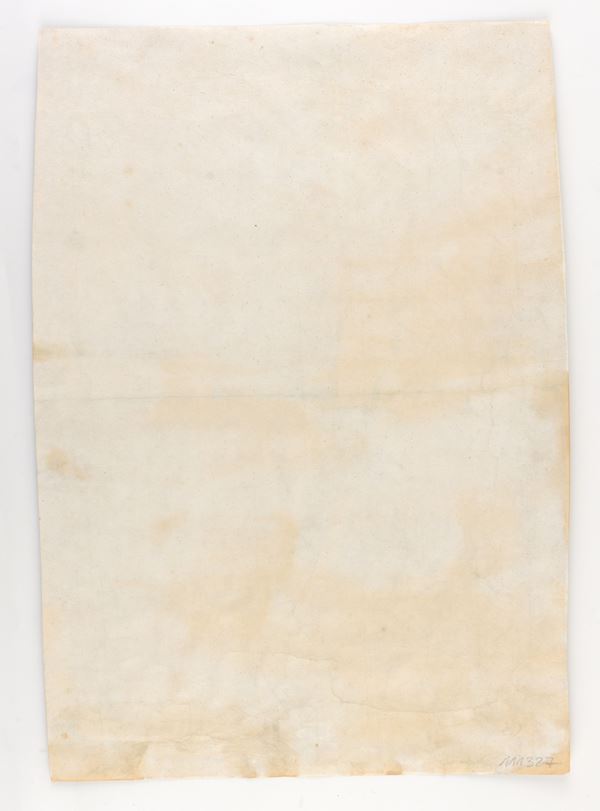 Sharp impression on laid paper with watermark. Trimmed. Some losses and tears in the lower part, well restored. Backed with tissue paper. Trace of a horizontal central fold. Old handwritten note at top. Stain in the center.