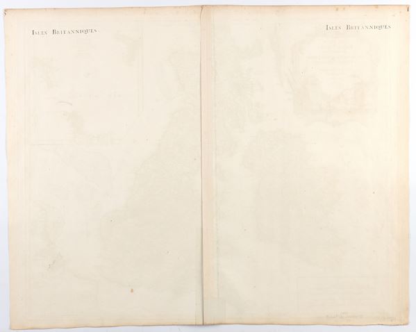 Map of the British Isles printed on two joined sheets of laid paper, each with watermark. Usual editorial twist. Overall in excellent condition except for a short tear on the lower margin and browning of the edges. Colored by hand.