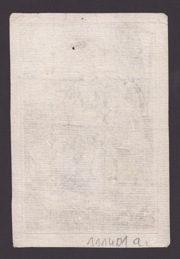 Printed on thin laid paper. In excellent condition except for a small hole near the monogram.
