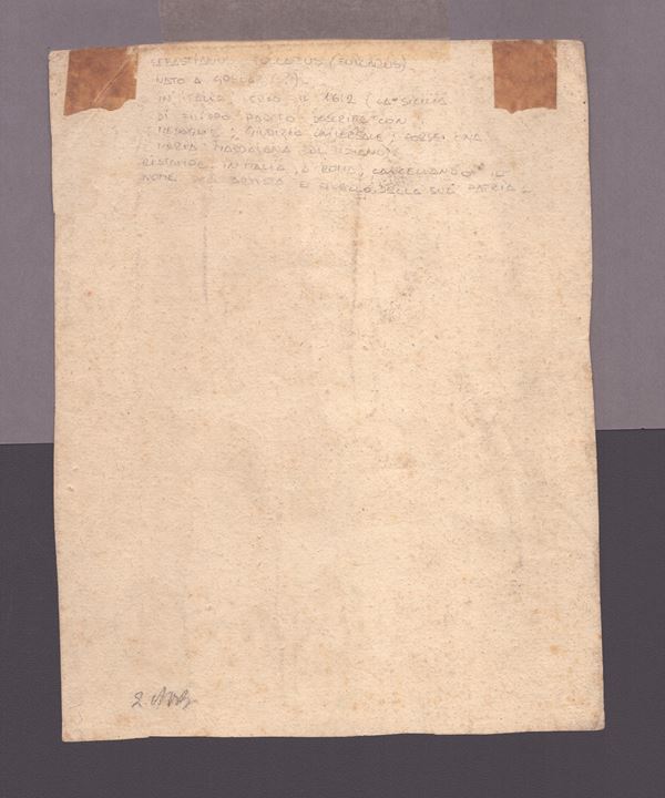 Fresh impression on thick laid paper. Trimmed example, with small margins beyond the edge of the plate. A crease at the top right corner. Residues of scotch tape on the reverse.