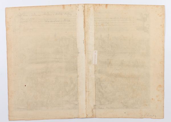 Fine, fresh impression on laid paper with watermark (IHS in the circle). Printed on two joined sheets. Trace of editorial fold and another vertical fold next to it. Some signs of foxing. Otherwise in very good condition.