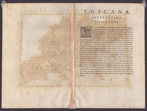 Etching, 182 x 262 mm (plate), approx. 220 x 310 mm (sheet). Map of Tuscany from Claudio Tolomeo's "La Geografia ... Nuovamente tradotta di Greco in Italiano, da Girolamo Ruscelli…".