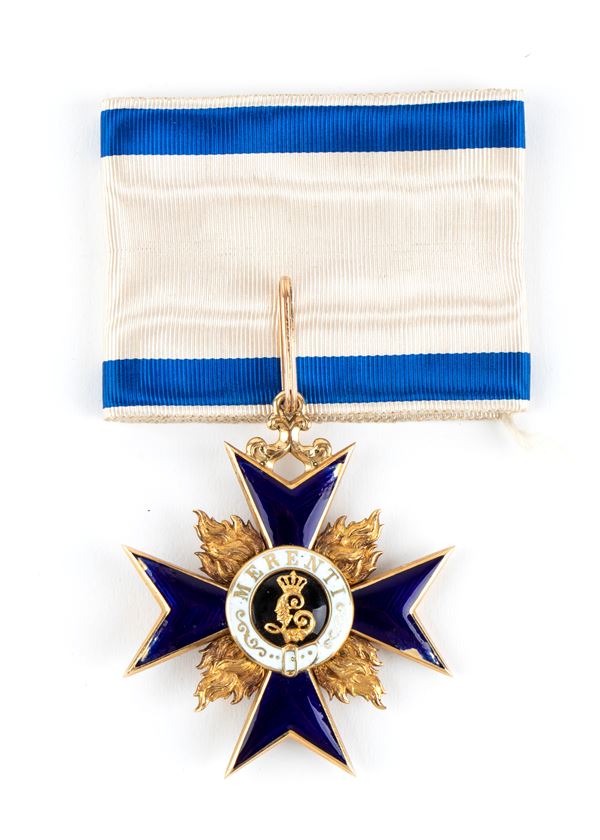 Insegna di seconda classe in oro e smalti policromi, con nastro di seta bianco bordato azzurro, nessun marchio, lievi difetti agli smalti, ottima fattura.