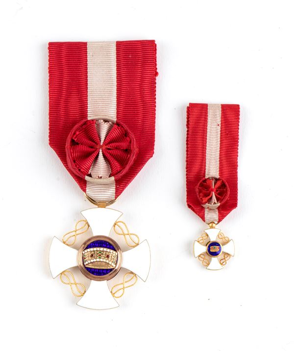 Bell'insieme di insegna e miniatura dell'Ordine, in oro e smalti, in astuccio con marchi del fabbricante, Cravanzola Roma