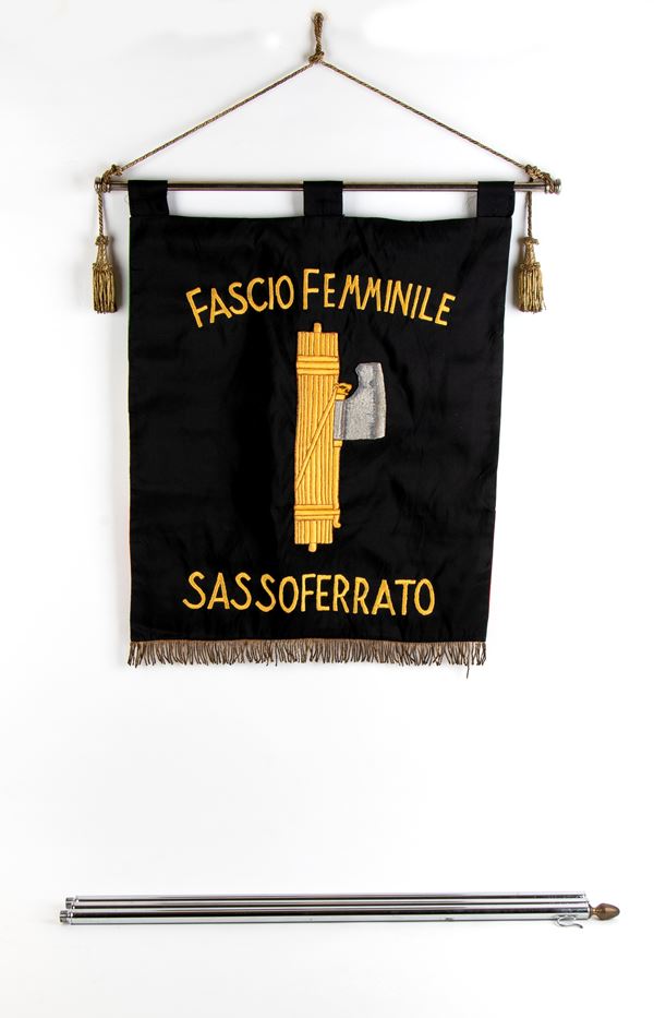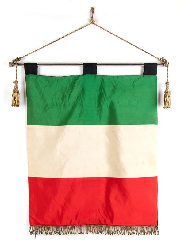 Ricamo in cotone su supporto di seta. Completo di cordoni ed asta in ottone nichelato. Ottime condizioni.