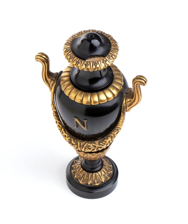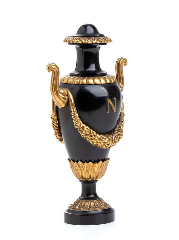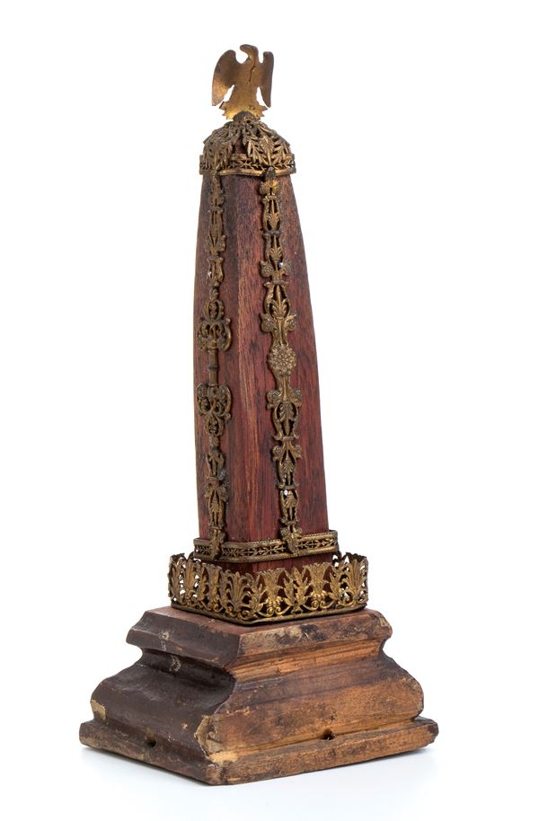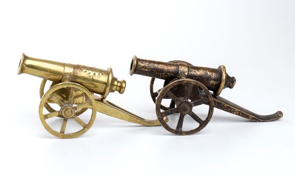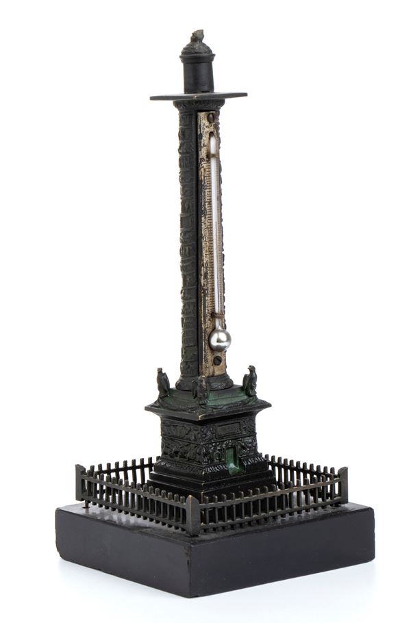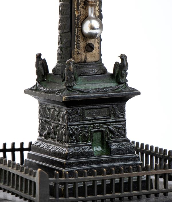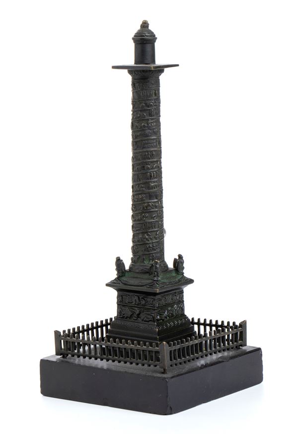 Lotto composto da 1 colonna di Place Vendome in bronzo e base di marmo h 19 cm; Obelisco in legno e bronzo con Aquila imperiale h 21 cm; Urna napoleonica in marmo nero e bronzo h 13 cm, Coppia di cannoni in miniatura in bronzo 5x12.