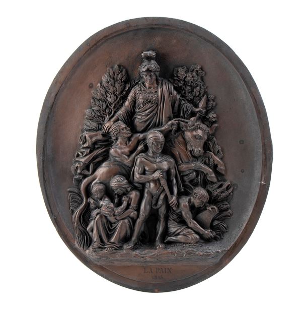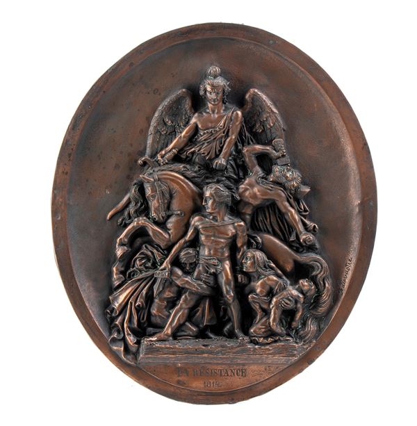 pair of large copper plaques made of electroplating and depicting “La Résistance 1814” and “La Paix 1815”, first half of the 19th century
