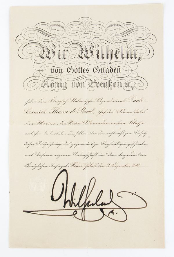 Set di gran Croce composto da placca in argento con centrale in smalti, pendente in oro e smalti marcato "N", Neuhaus & son Berlin al braccio inferiore, fascia di seta e diploma di concessione firmato per esteso dall'Imperatore Guglielmo, in ottimo stato.
