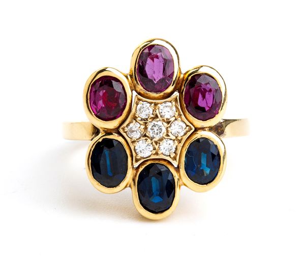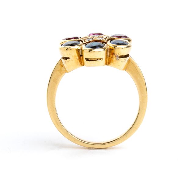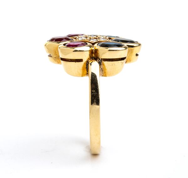 18k yellow gold, flower shaped, embellished by diamonds, rubies, and sapphires.