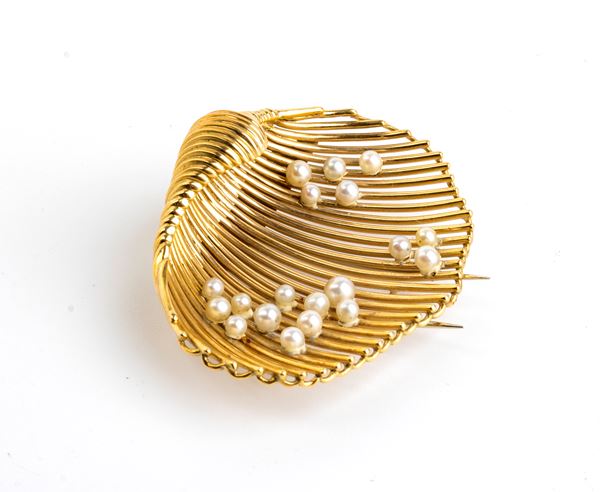 - 18k yellow gold in the shape of a shell, embellished with precious stones, diamonds and a central pearl.