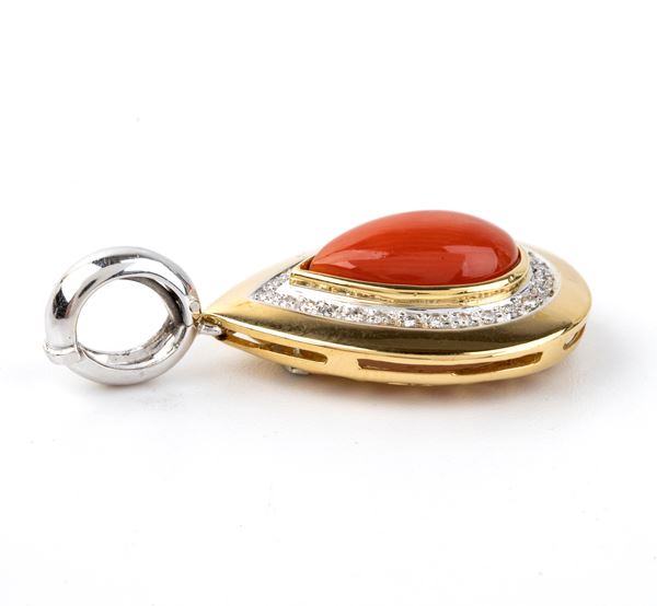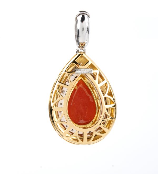 pera shaped pendant set with Mediterranean coral (corallium rubrum), framed by diamonds.