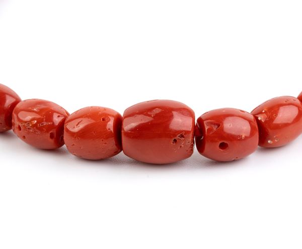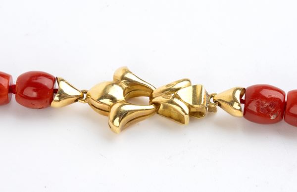 one strand of graduated Mediterranean beads (corallium rubrum); 18k yellow gold firmness.