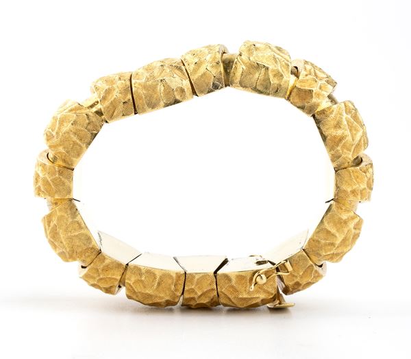 18k yellow gold, jointed link bracelet with satin cortex texture.