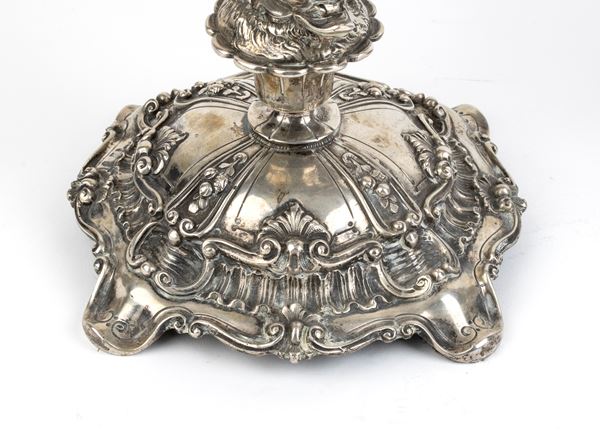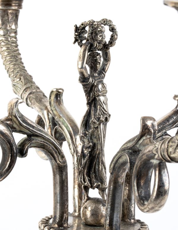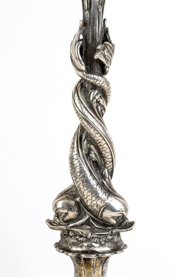 shaped base with vegetal motifs, twisted stem with two intertwined dolphins, upper part with four lights centered by a female figure with tambourines.
