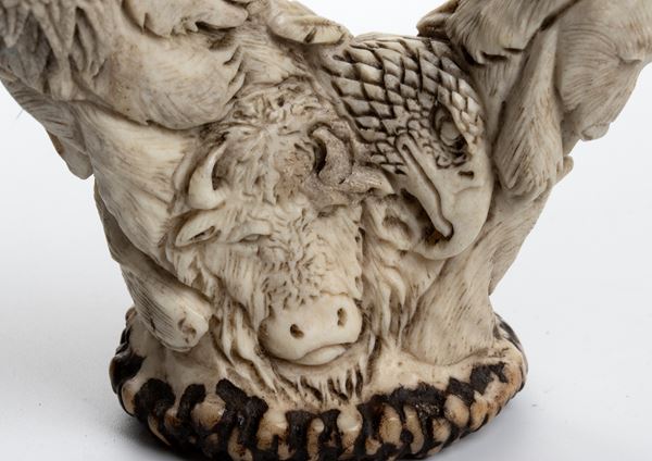 Carved antler of a deer (Cervus elaphus Linnaeus, 1758) depicting a Native American head from numerous animal heads, wolves, oxen, birds of prey, bear horses, ect.
