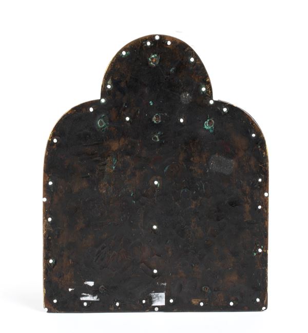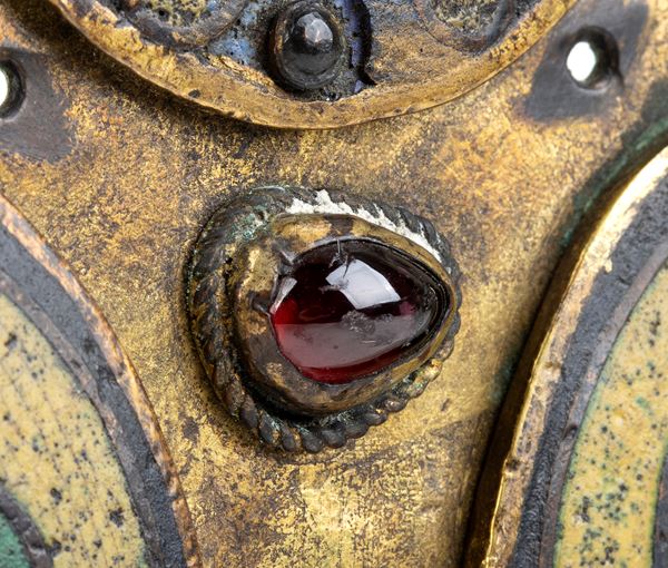 made of gilded bronze, this object features a perimeter cord with a coloured stone in the centre. Two round pointed rectangular niches, decorated with polychrome champlevé enamel, depict two half-length saints. This style of enamel is inspired by 12th century works. At the top, there is a medallion decorated with polychrome champlevé enamel, possibly depicting a coat of arms. The frame is pierced, presumably to allow it to be fixed with nails.