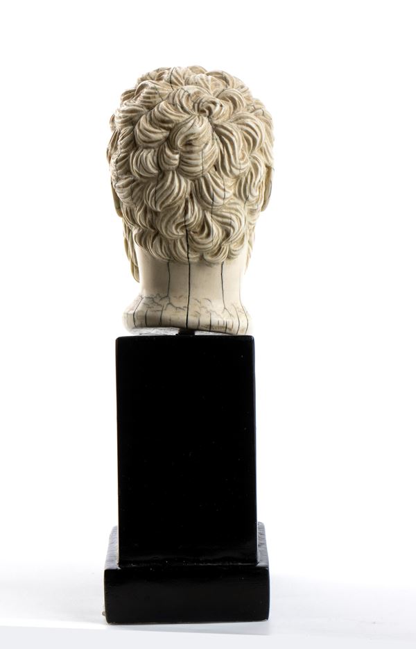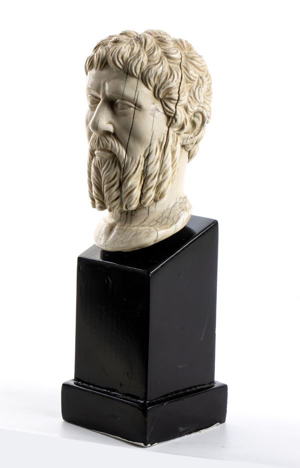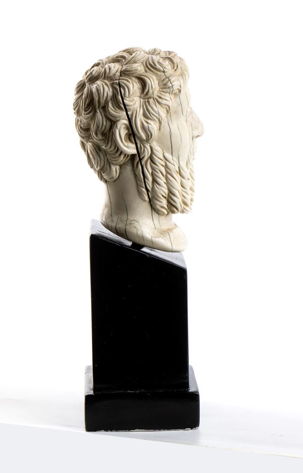 elephant ivory carving (Loxodonta africana Blumenbach, 1797 or Elephas maximus Linnaeus, 1758) depicting the virile head of a Roman emperor, possibly Hadrian. Modern wooden plinth