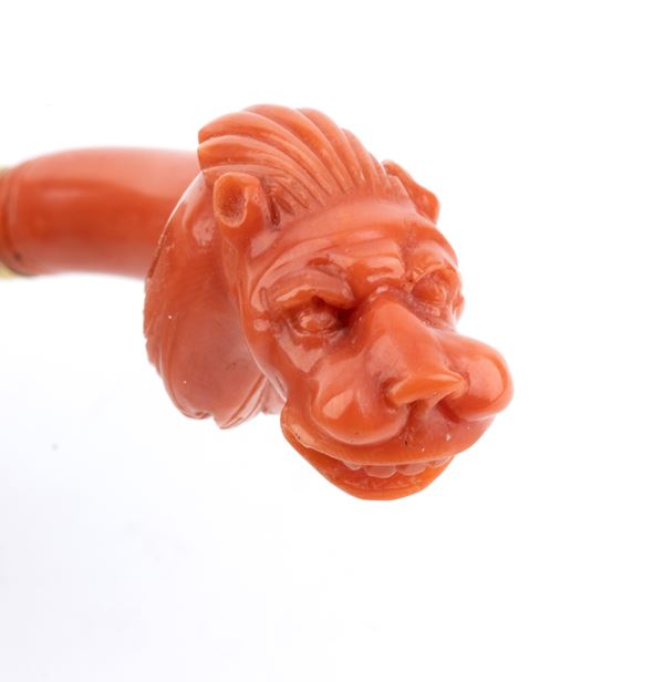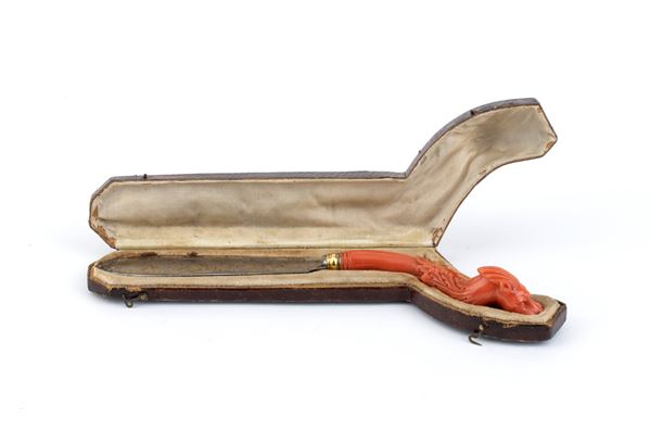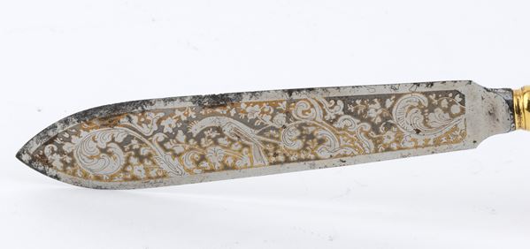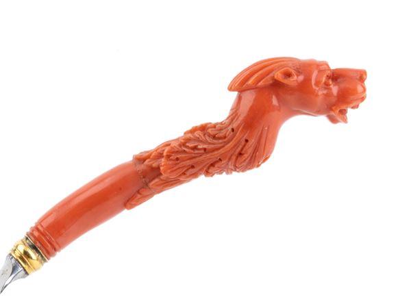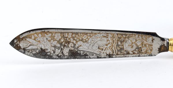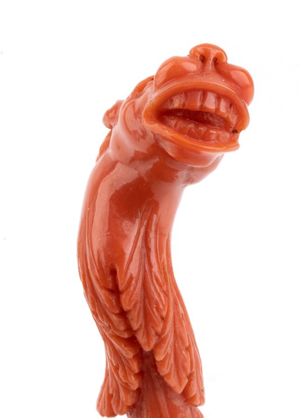 with dragon-shaped handle made of Mediterranean coral (corallium rubrum) and blade decorated in agemina with vegetal and floral scrolls, a female figure and a bird. Within original case.