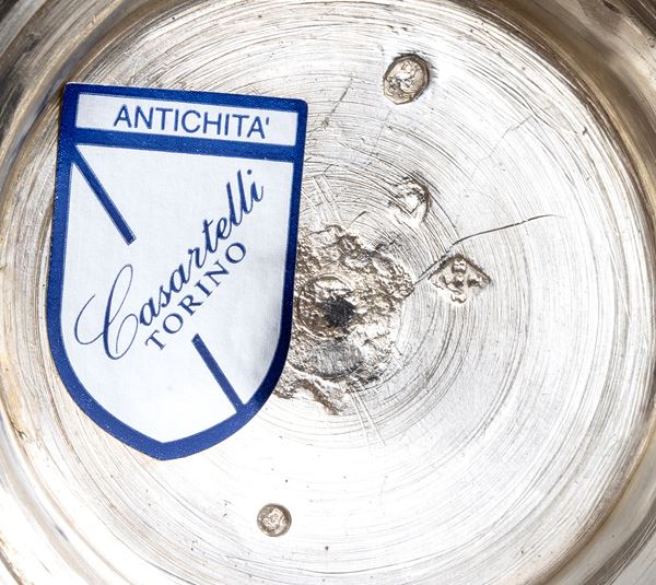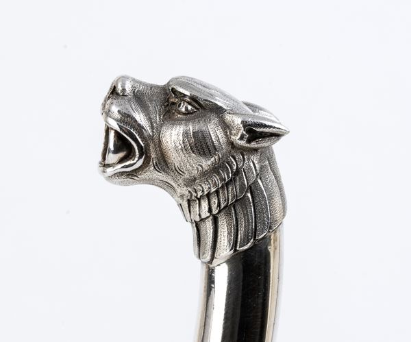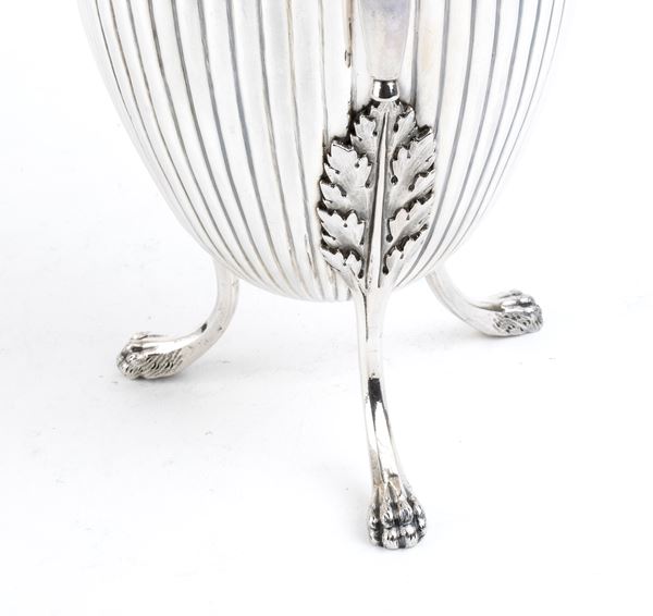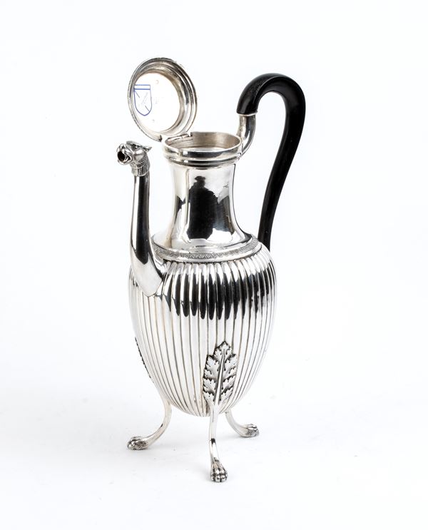 plain ovoid body with vertical flutings resting on three ferine feet and oak leaf upper attachment, tapered neck with moulded pourer and zoomorphic spout. Hinged lid with acorn grip, ebony handle. 950/1000 silver, hallmarked with the marks for silver at the first standard in use in Paris from 1798 to 1809, with the unofficial hallmark used by the Association des Orfรฉvres in Paris for a silver fineness of 950/1000 "head of a Greek woman with letter P" and with the silversmith's initials J.B.P. for Jean-Baptiste Potot.