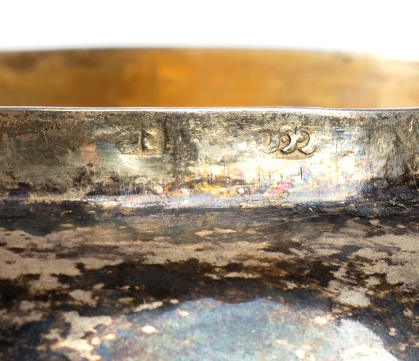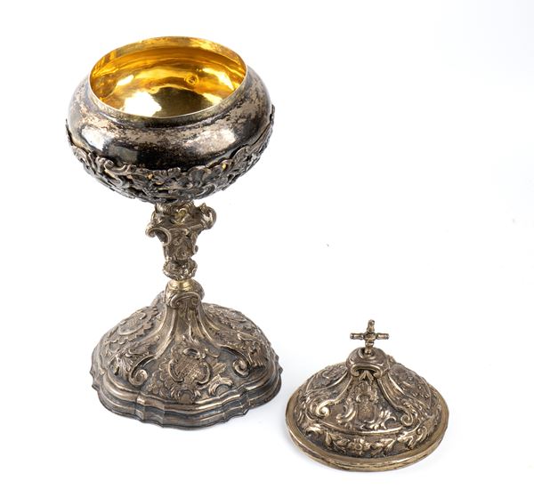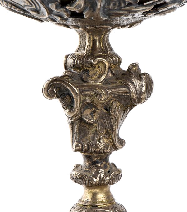 shaped base with vegetal decoration, smooth cup with gilded interior and rich undercup with foliate volutes. Hallmarked with the mark of the 'bulla' of Palermo depicted by a high-flying eagle in use from the 18th century onwards, silversmith and consul unidentified.
