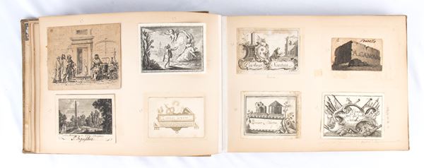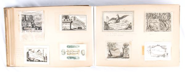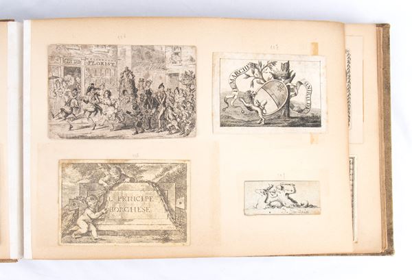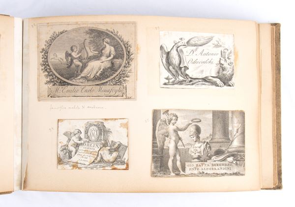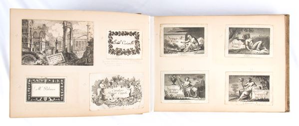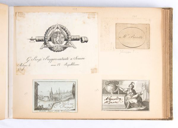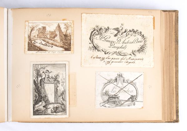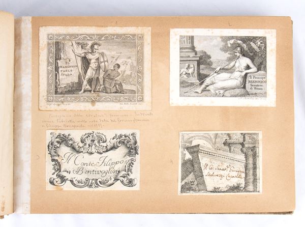 Another album with an important collection of business cards from the late 18th and early 19th century. All made with printed engravings, woodcuts on vintage paper, some with autograph ink inscriptions of the holders represented on the ticket itself.
