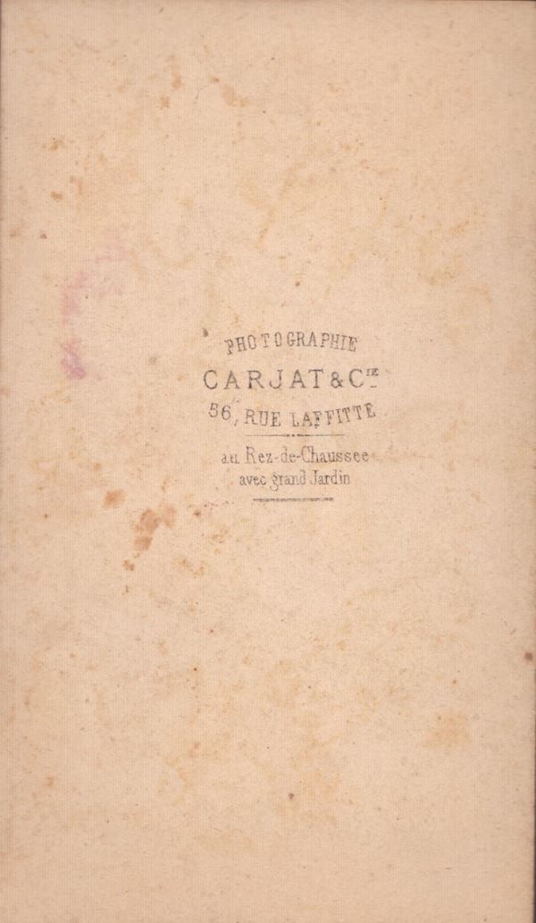 The photo is signed Carjat & C., mounted on cardboard. Original, slight scattered browning due to age, in excellent condition. Measures approximately 6.3x10.7 cm