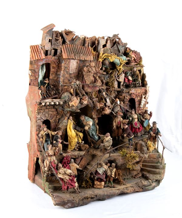 Beautiful composition of nativity scene in various materials, wood, cork, plaster, terracotta, fabrics, etc from the late 19th century (from Anton Giulio Barrili inheritance). Very delicate, good condition, some figures and details need to be fixed and repositioned