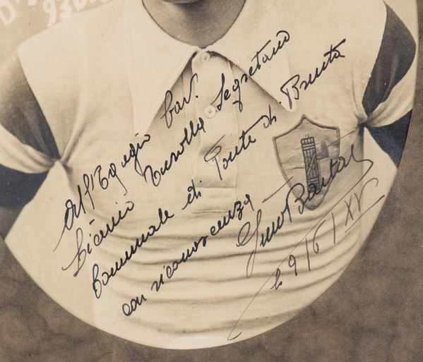 The photo portrays the winning champion of the 1936-37 Giro d'Italia wearing the race jersey, with a shield with a fasces sewn onto his chest. An image with Bartali at the time of the twenty years of fascism is very rare, also considering what the runner did during the period of deportation of Italian Jews to Germany.