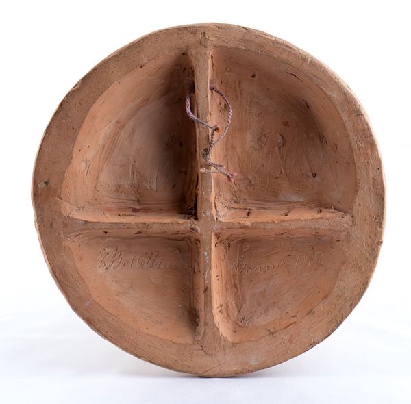 Terracotta signed E.Bellettini - Rome 1940, celebrating the Rome-Berlin-Tokyo Axis, the Tripartite. The faces of Mussolini, Hitler, Hirohito are in relief above the inscription AXIS - BERLIN ROME TOKYO with the fascist, Nazi and rising sun symbols. In perfect condition, measuring 18 cm in diameter