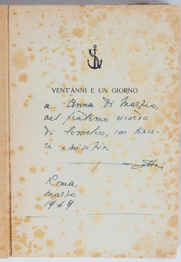 Original dedication and autograph by Giuseppe Bottai, on the title page of the volume he wrote "Vent'anni e un giorno", published by Garzanti, first edition of 1949.