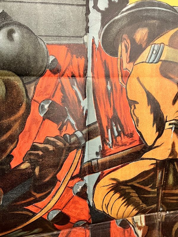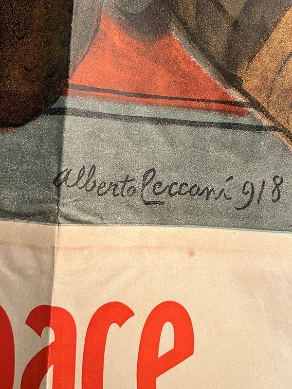 Original offset lithographic print poster, First World War propaganda entitled "HOW THE DOOR OF PEACE WAS OPENED" designed by Alberto Cecconi in 1918, signed lower left. Obvious and clear erotic allusions to the opening and penetration of the Austro-Hungarian enemy defenses. Two soldiers of the European alliance, an Italian and an Englishman, launch themselves with the bayonet against the enemy's door, tearing it in the middle.