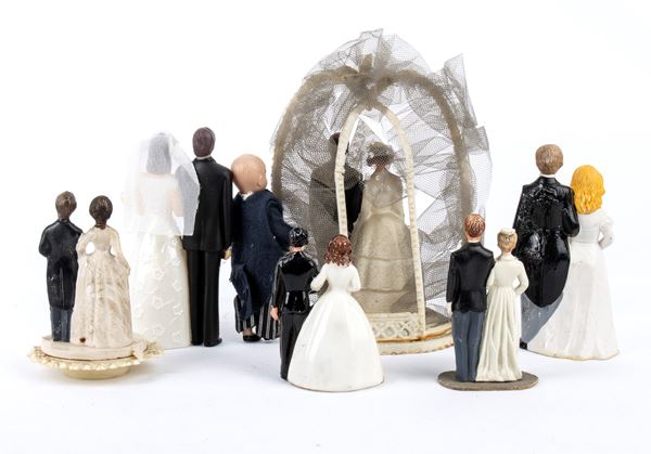 Lot of 6 wedding couples in ceremonial dress, plastic and accessories, and 1 single figure, mid-20th century. Measurements 7 - 16 cm. In good condition
