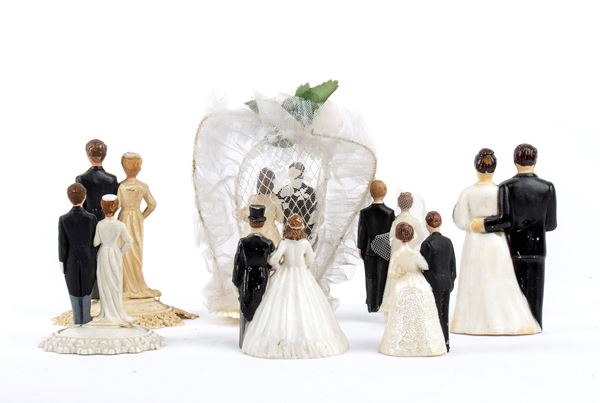 Lot of 7 wedding couples in ceremonial dress, plastic and accessories, mid-20th century. Measurements 7 - 16 cm. In good condition