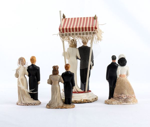 Lot of 4 wedding couples in ceremonial dress, composition (without brands), mid-20th century. Measurements 7-15 cm, in good condition, missing and broken on a column of the gazebo