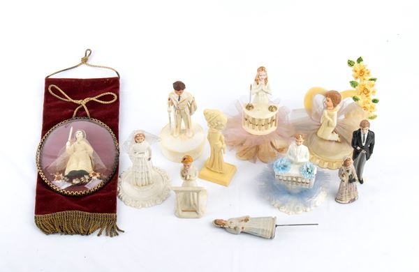 Lot of 9 figures of communicants in plastic and various materials, plus 1 figure of a girl communicant in a frame with glass, various sizes, good condition. Unmarked, mid 20th century.