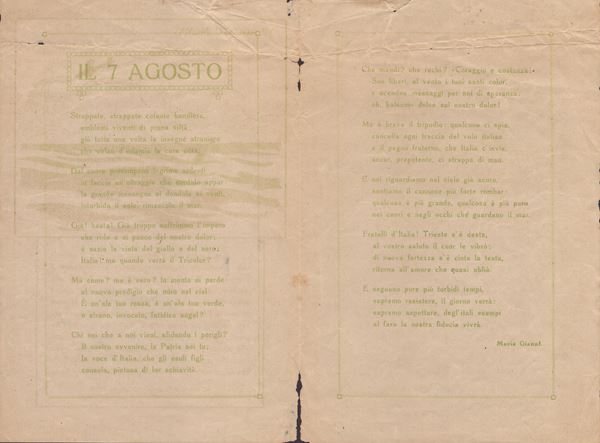ยซ Courage brothers! Courage and perseverance! To free you as soon as possible, we fight breathlessly. In Trentino, in Cadore, in Carnia, on the Isonzo, we are gaining ground every day. There is no enemy effort that is not broken by the valor of ours. There is no impudent lie that is not deflated by our bayonets. We have already taken twenty thousand prisoners. In short, the entire Karst will be conquered. I tell you, I swear to you, brothers: our victory is certain. The Italian flag will be planted on the large Arsenal and on the Colle di San Giusto. Courage and perseverance! The end of your martyrdom is near. The dawn of our joy is imminent. From the heights of these Italian wings that the brave Miraglia leads, I throw this message and my heart to you as a pledge. I Gabriele D'Annunzio. In the sky of the Fatherland, 7 August 1915. ยป - Two-page booklet, four sides, printed in green, with a poetic composition by Maria Gianni, published by Corriere della Sera on 30 August 1915. Measurements of a page 14x20.7 cm. Fair conditions, tears and folds