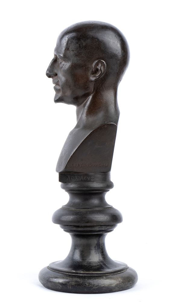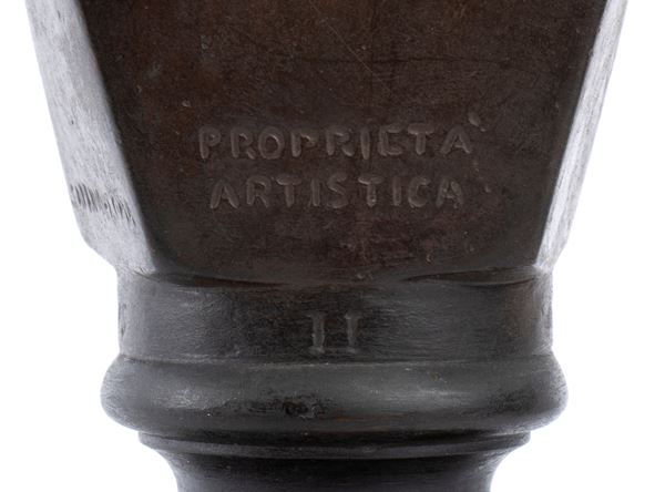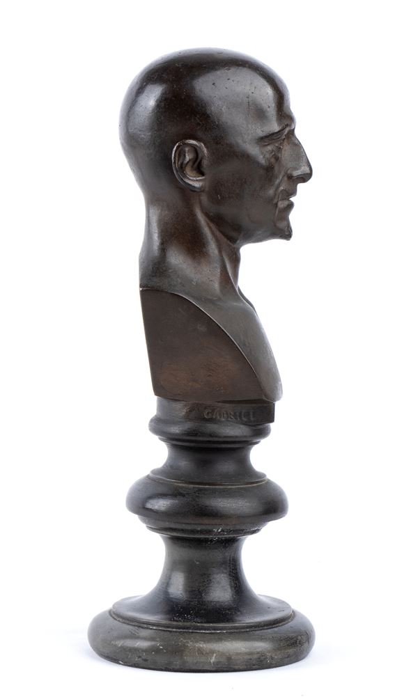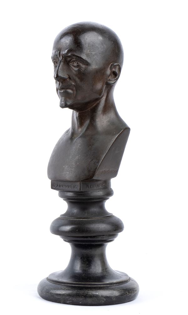 Bronze bust, with bare back, of GABRIEL D'ANNUNZIO ADRIACUS, the Pope in a rare artistic depiction. The title of the work "GABRIEL D'ANNUNZIO ADRIACUS" created by the Sardinian sculptor Lorenzo Caprino, to be sold for the benefit of the various action committees of the Italian combat fascis, is engraved around the circular base of the bust. Each bronze copy cost 230 Lire including the "luxury tax" - On the sides of the bust we find engraved "Artistic Property L.Caprino - Rome" - Equipped with a turned wooden base. Bust height 22 cm. Original from the end of '920s. Very good condition