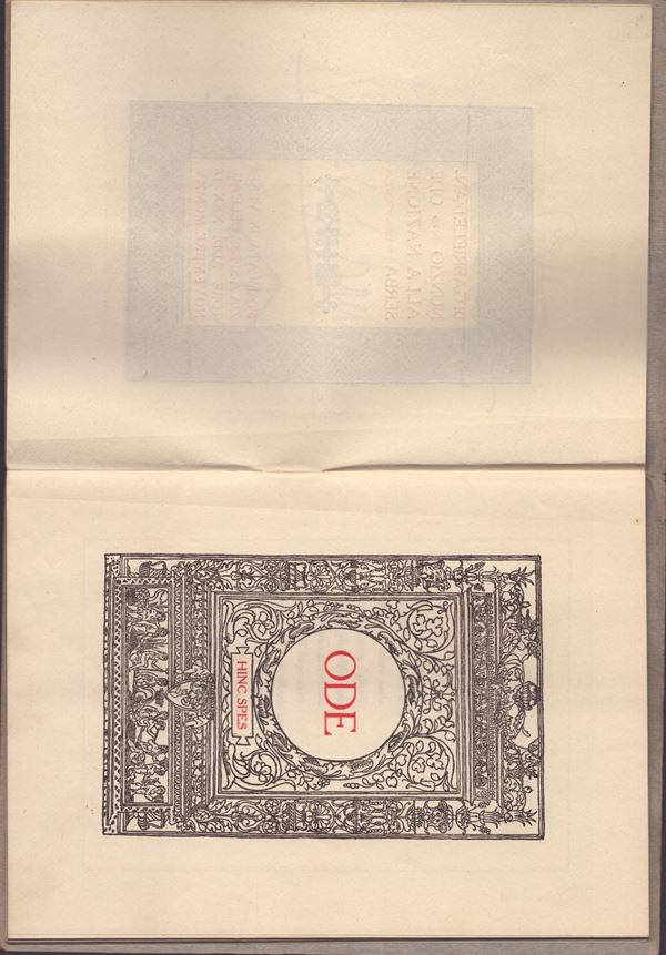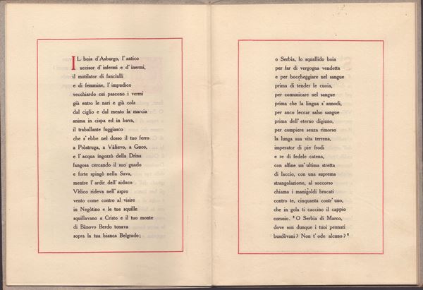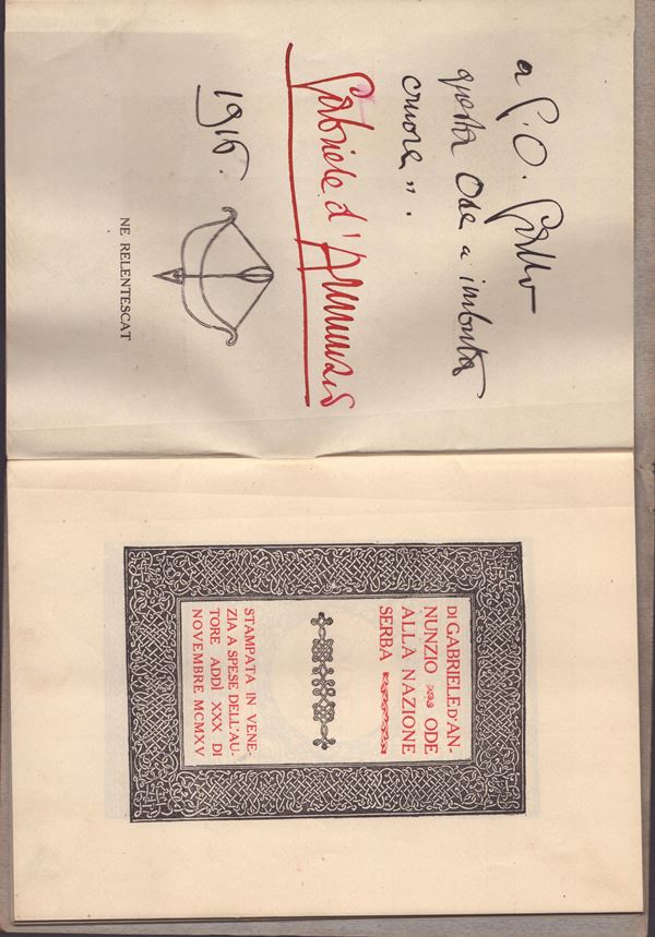 Volume entitled "ODE TO THE SERBIAN NATION" written by Gabriele d'Annunzio, "Printed in Venice at the expense of the author on the 30th of November MCMXV" - Black and red ink. First title page printed in red within a black frame, second title page (black and red) "Ode. Hinc spes". On the counter-title, "Ne relentescat" is printed under the bow and arrow, surmounted by d'Annunzio's autograph dedication addressed to G.O. Gallo, 1916. Cards protected by original blue-grey cardboard bearing the Serbian coat of arms at the bottom right. Stapled sheets, red cord missing. Excellent condition, measures 14.3 x 19 cm. Very rare