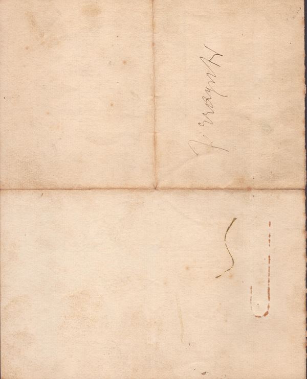 Message (pizzino) on rough paper written in black ink (faded), with signature at the bottom, autograph, which reads "Forgive me! I'm not dressed yet. Can you come back in twenty minutes? Thank you - d'Annunzio" On the back surname of the probable recipient of the pizzino, "Ferraguti" who could be the illustrator Ferraguti. Sheet measures 22x17.5 cm, in good condition, scattered marks and stains, central folds