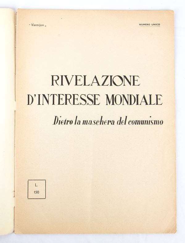 Single issue, Vermijon, 1957 "Revelation of worldwide interest - behind the mask of communism", editorial paperback, pp.23, folds and signs of use. Fair conditions. Measurements approximately 24.5x34.5 cm