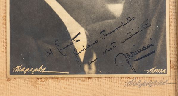 Autographed photo with dedication by Roberto Farinacci. Artistic photo signed in pencil by Bragaglia. in a brass sheet frame, with applied lateral fasces. Frame dimensions approximately cm.35x27. Good conditions