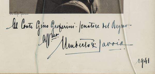 Fotografia incorniciata di Umberto di Savoia. La dedica riporta: " Al Conte Gino Gasperini senatore del Regno". La fotografia รจ in ottimo stato di conservazione mentre la cornice presenta il vetro rotto.