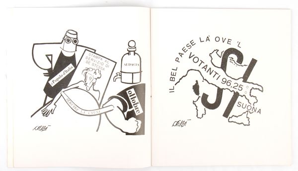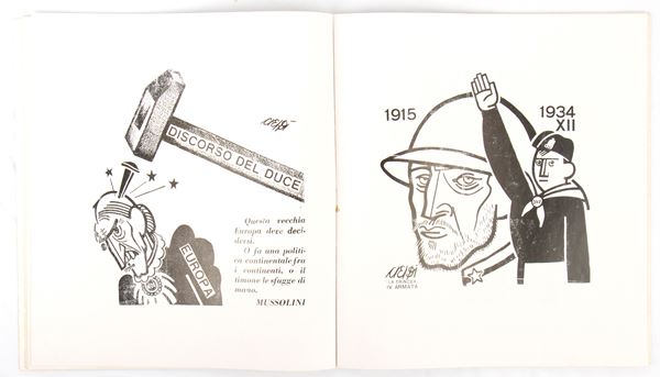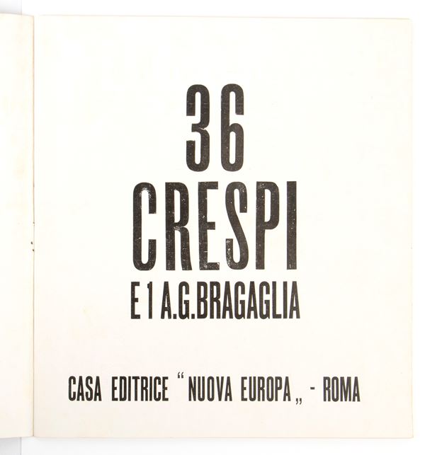 Very rare volume entitled "36 CRESPI and 1 A.G.BRAGAGLIA" Nuova Europa Publishing House - Rome - Quotidiano del fascismo universal - Director Asvero Gravelli (founder and director of AntiEuropa) - Introduction by Anton Giulio Bragaglia, followed by 36 reproductions of political satire illustrations, fascism, caricatures performed by Daniele Crespi "one and three". Dimensions approximately 25x22 cm, editorial paperback, 48 pages, late 1930s, in perfect condition