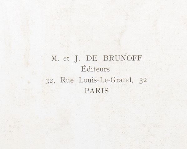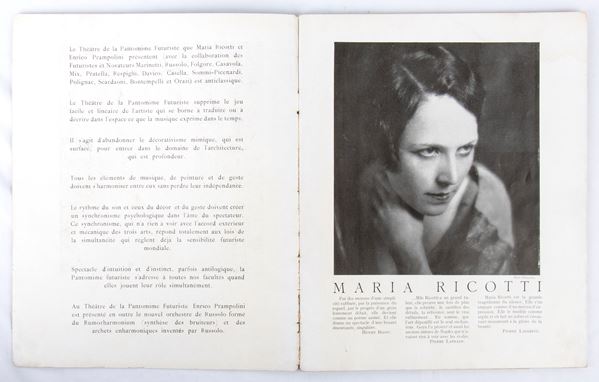 M et J. de Brunoff Editerus, [1927], s.d. In 8th. Double staple, paperback in white coated paper, color drawing by Prampolini on the front cover with b.w. photograph. in the text, humidity marks, defects on the paperback.